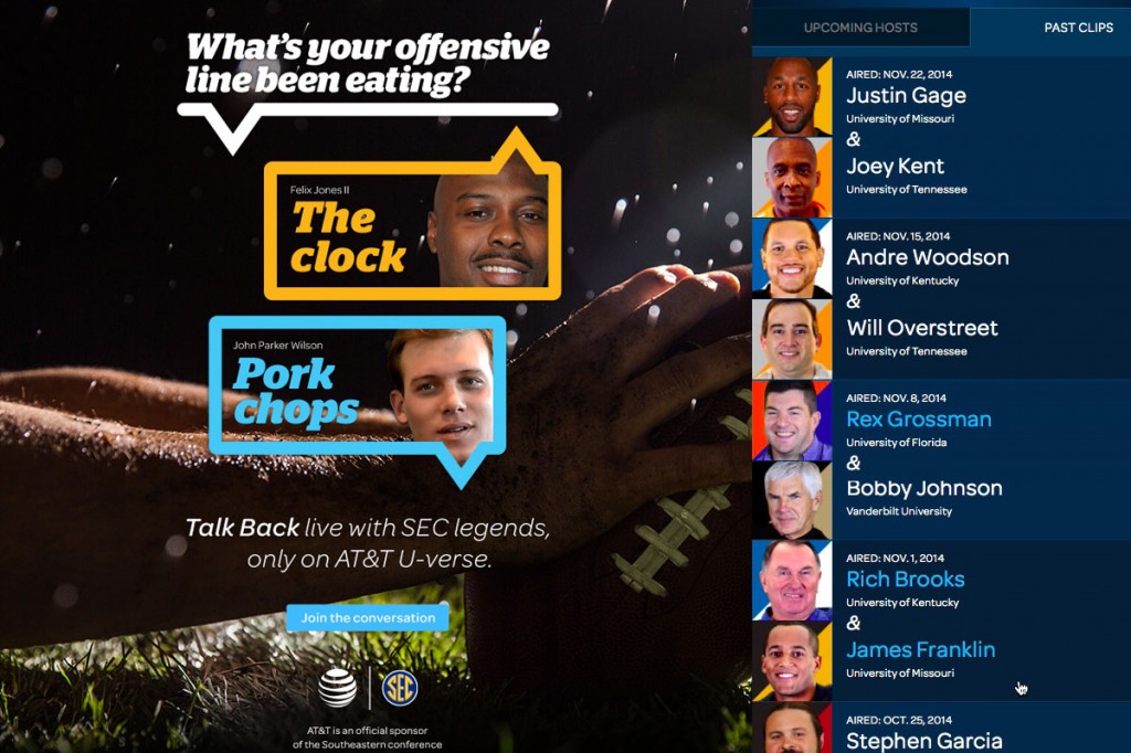 We held a live broadcast at the Football Hall of Fame in Atlanta for an entire season of SEC games. The app broke records for dwell time pulling in customers who were watching the games while on their phones. It pioneered live social integration for U-verse and the web application was continued to be use for internal AT&T events.