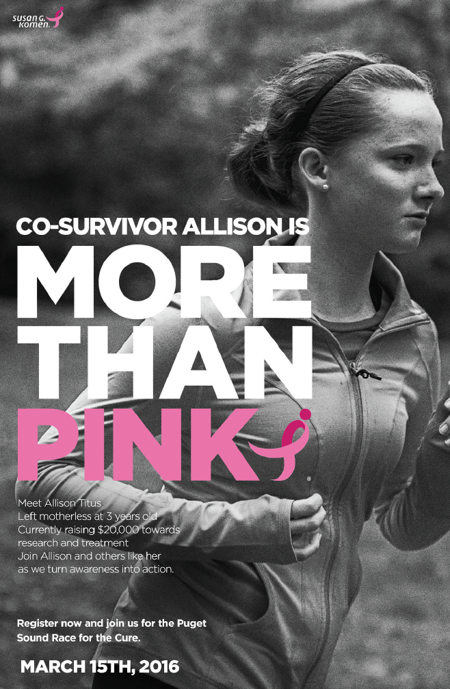 We identified dozens of inspirational figures within the movement from celebrity, to scientists to activists, all the way down to individual fundraisers. In these grass roots fundraisers we found inspiration. People who represented something that was more than pink. By elevating stories of action we began refocused the brand identity from a symbol, the pink ribbon into a movement. All lead by people like Alison.