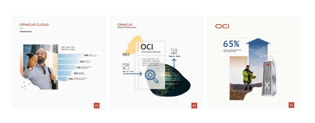 But Oracle had a problem. The campaigns they had been running relied too heavily on product color pallets. Diminishing the core brand. OCI was asked to demonstrate how we could simplify the brand color pallet and begin building a unique approach for OCI that better leverages the Oracle brand identity. We used this exploration to evolve the look and feel for OCI seen today.